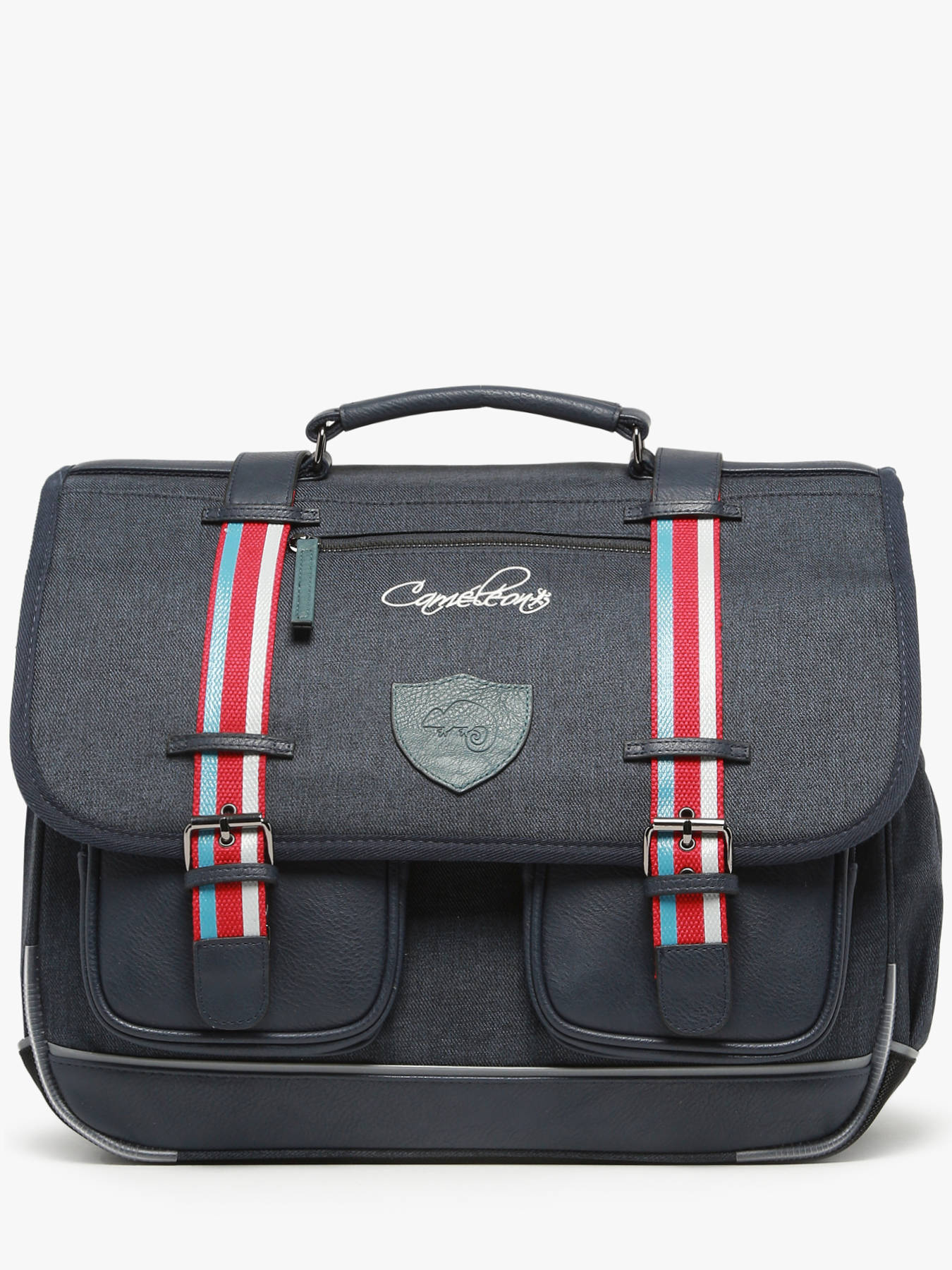 41 cm - 24 liter - 1.33 kg ~ Deze schooltas uit de Vintage collectie van het merk Caméléon heeft een breedte van 41 cm. Ideaal voor vanaf het 4de leerjaar! Dit model heeft een duidelijke vintage look, dankzij twee voorvakjes en de riempjes met gespen. De schooltas beschikt over drie ruime compartimenten, die schriften (24x32 cm), mappen en schoolboeken van A4 formaat kunnen bevatten. Onder de overslagflap bevindt zich ook een uniek opbergvakje, voorzien van een gratis liniaal. De twee kleine ritsvakjes vooraan zijn perfect om een snack of andere kleine spulletjes in te stoppen. Dit model beschikt ook over een naamlabel aan de achterzijde, en kan makkelijk gesloten worden dankzij een dubbel kliksysteem. Voor optimaal comfort zijn de rugzijde en schouderbanden extra gewatteerd. Dankzij enkele reflectoren kan uw kind zich ook veilig in het verkeer begeven. Vintage op z'n mooist!