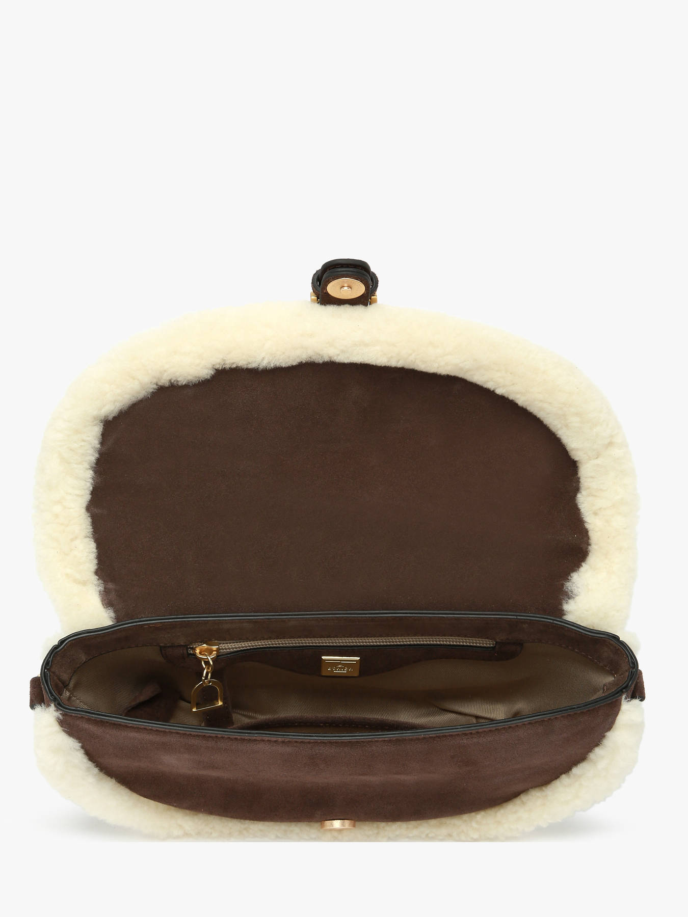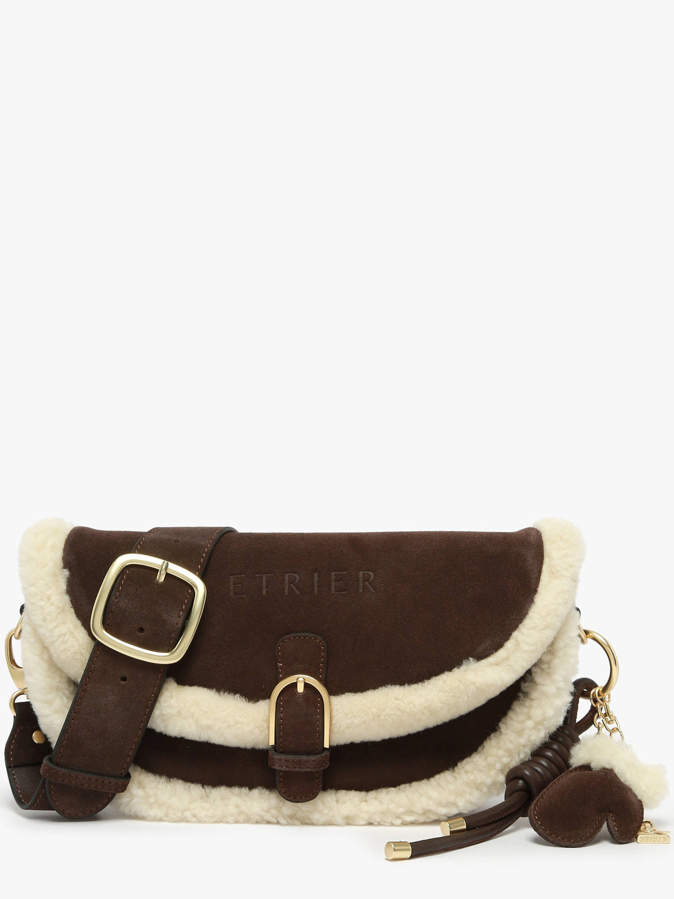 De cross body tas ETRIER uit de ALPIN-lijn is vervaardigd uit suèdeleer, afgewerkt met schapenvacht, en heeft een achterkant van glad leer voor een langere levensduur. Voor comfortabel hoog dragen is de verstelbare en afneembare schouderriem een perfecte aanvulling op dit elegante en praktische model. De tas sluit met een klep die vastklikt dankzij een magnetische drukknop. Binnenin zorgen een open vak en een ritsvak voor optimale organisatie. Getrouw aan de ALPIN-wereld is de tas versierd met een decoratieve sleutelhanger met de symbolen van het merk: want, stijgbeugel en de letters ETRIER.